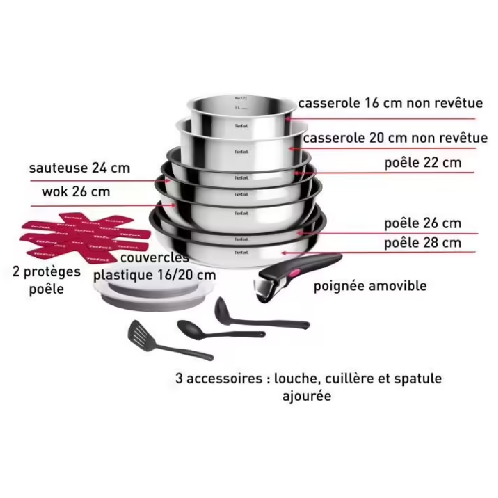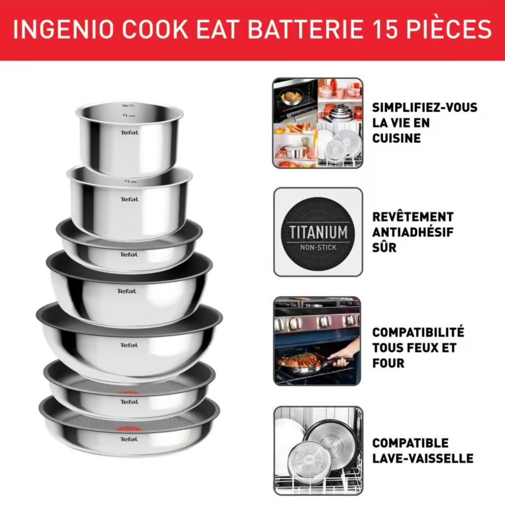 Casseroleries 15Pc Tefal Ingenio L881SF04 – Avec Casseroles Et Poêle – Inox